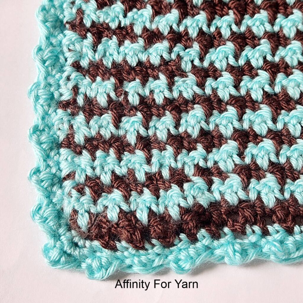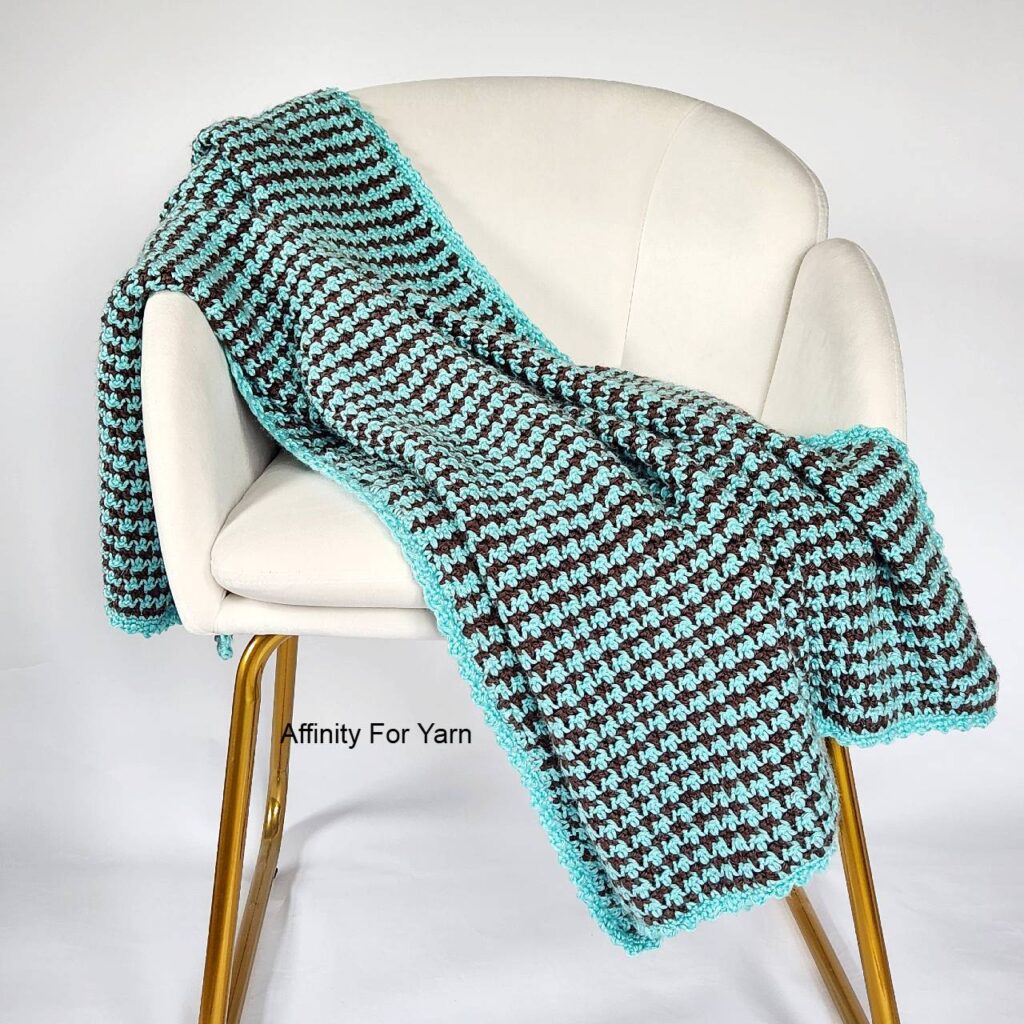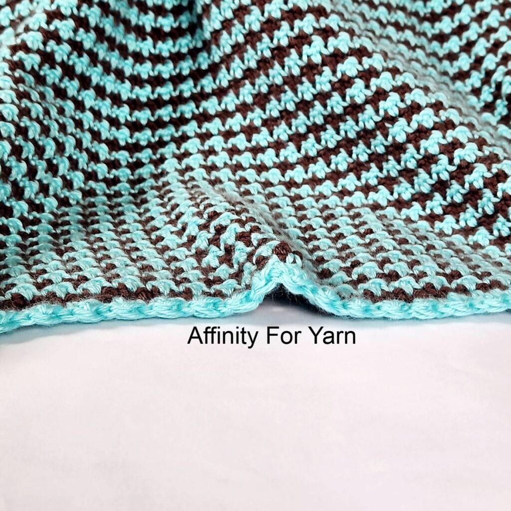 - For the blanket, there’s no right and wrong side of the blanket. However, there is a side where the Robins Egg yarn shows through more and a side where the Taupe yarn shows through more. This will be important when doing the border as you’ll want to make sure the Bobble shows on the side of your choosing. Ex: For my blanket I wanted the Bobble to show on the Robins Egg side, so when I did the border, I had the Taupe side (wrong side) facing me.