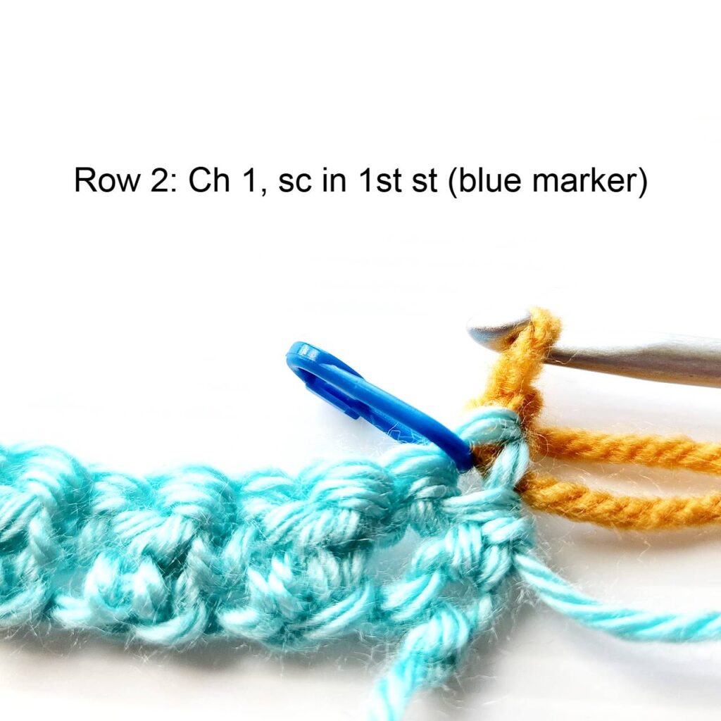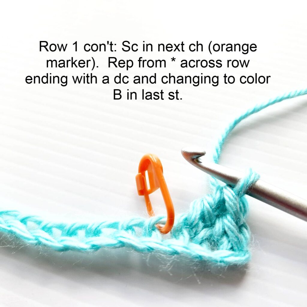 ROW 1: Sc in 2nd ch from hook, *dc in next ch, sc in next ch. Rep from * across row ending with a dc and changing to color B in last st, turn. (114 sts)