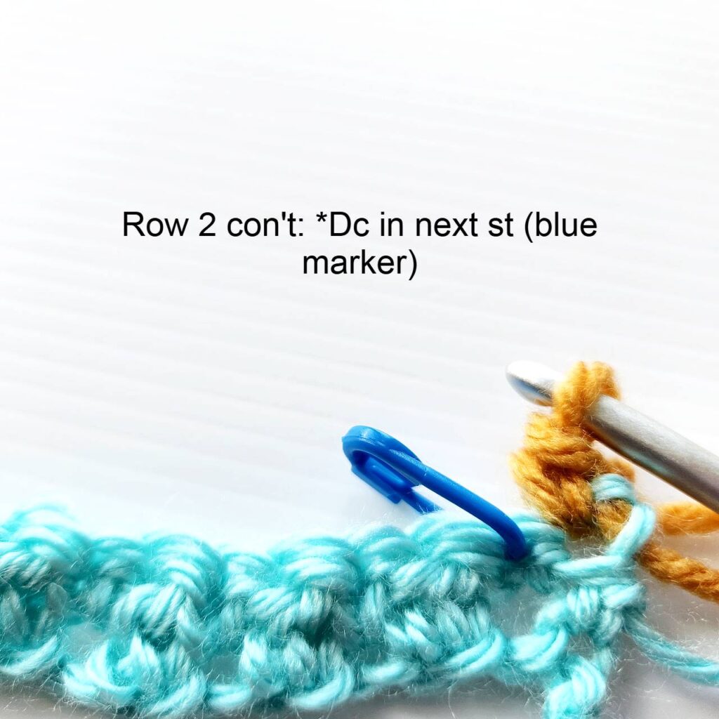 ROW 2: Ch1, sc in 1st st, *dc in next st, sc in next st. Rep from * across row ending with a dc and changing to color A in last st, turn. (114 sts)